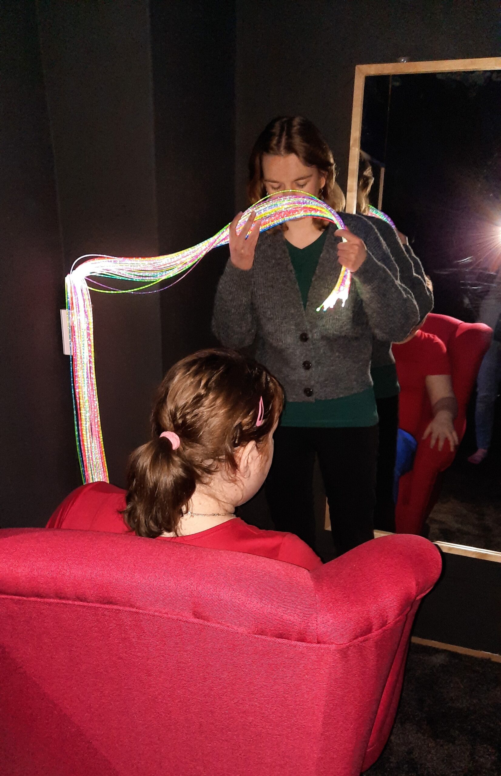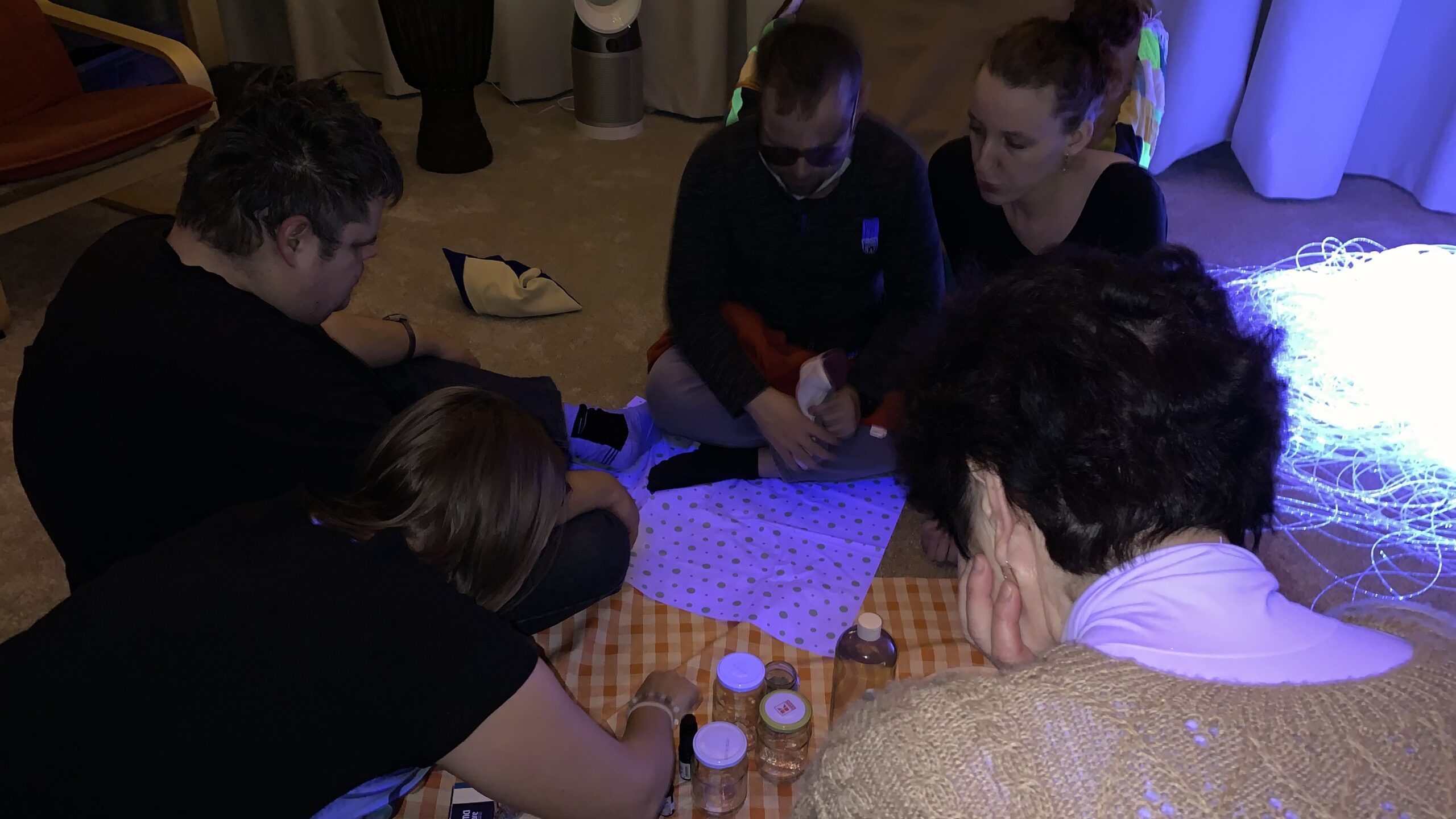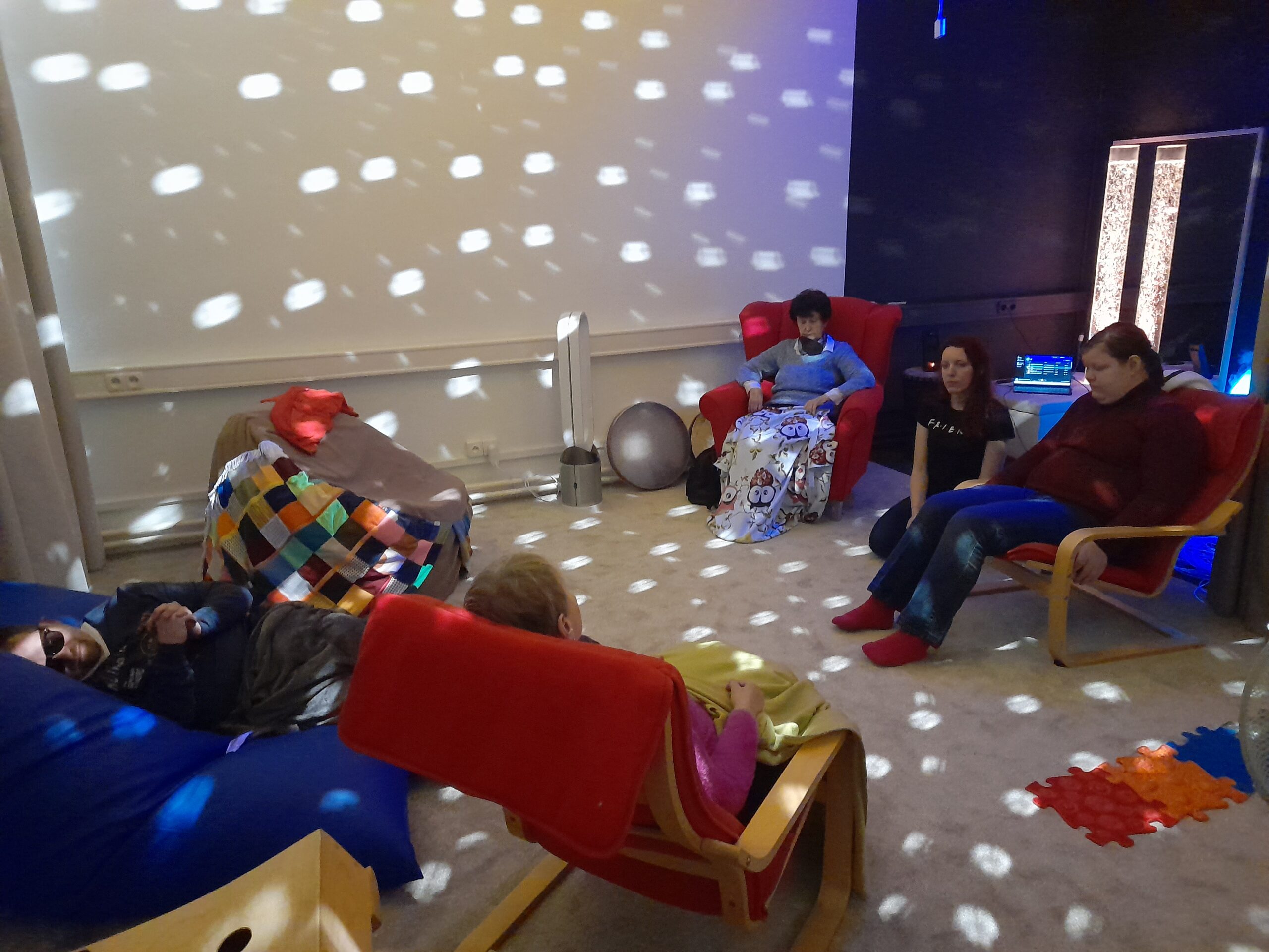 V průběhu loňského roku byla na ostravském středisku KAFIRA vybudována snoezelen místnost, která se postupně dolaďuje. Momentálně se, díky finanční podpoře Nadačního fondu Českého rozhlasu Světluška, MSK a dalších, nachází ve finální fázi. Jelikož máme klientelu různé věkové struktury (od dětí až po osoby seniorského věku), nechtěli jsme tvořit místnost tmavou, která by na ně mohla působit stísněně. Rozhodli jsme se proto pro koncept světlé místnosti s tmavým koutkem. Chtěli jsme otevřený volný prostor, který je pro klienty zároveň příjemný, klidný a bezpečný. Světlou část místnosti si vždy ladíme díky pomůckám a doplňkům k tématu dané aktivity a užíváme ji mnohdy pro aktivity ve větší skupině. Tmavý, téměř černý, koutek využíváme hlavně pro práci s prvky zrakové stimulace. Tyto dvě části místnosti, světlou část a tmavý koutek, lze od sebe oddělit závěsem, nebo nechat celý prostor otevřený.