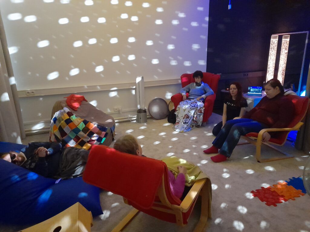 Ve snoezelen místnosti mají naši klienti možnost se více soustředit na danou aktivitu a vnímat veškeré podněty, které jim pracovník nabídne. Snoezelen místnost využíváme jak k multismyslové stimulaci, při níž pracujeme s různými sluchovými, zrakovými, haptickými, čichovými a dalšími podněty, tak také během nácvikových kurzů, např. Tréninku paměti. Klientům dává místnost možnost být v klidném, příjemném, záměrně stimulujícím a bezpečném prostředí. Díky vybavení místnosti, jako je koberec, hvězdné nebe, pohodlná křesla, sedací vak a dalším, si klient může vše uzpůsobit ke svému pohodlí a pohodě. A také se může soustředit na danou aktivitu bez dalších rozptylujících podnětů.