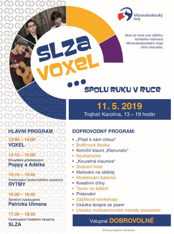 2. ročník benefiční akce „Spolu ruku v ruce“ na podporu aktivit lidí, kteří se starají o své blízké členy rodiny s postižením. Hlavní program akce začne ve 13 hodin vystoupením Voxel (Václav Lebeda) a zakončena bude vystoupením kapely Slza od 17:30.