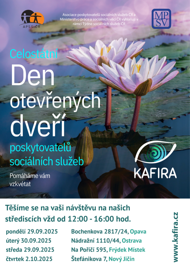 Do akce se zapojuje také KAFIRA o.p.s.. Přijďte se k nám podívat, zjistit, co děláme, a jak můžeme pomoci vám, vašim blízkým či známým.