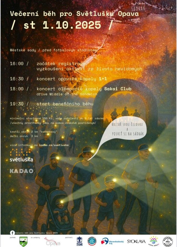 ve středu 1. října 2025 se v opavských Městských sadech uskuteční pátý ročník charitativní akce Večerní běh pro Světlušku. Tento benefiční běh podporuje projekty Nadačního fondu Českého rozhlasu, který pomáhá lidem s těžkým zrakovým postižením.