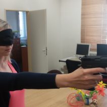 Jde o laserový trenažér, kde postoj a držení pistole odpovídá běžné střelbě, zaměřování na střed terče se provádí sluchem – střelec je naváděn zvukem, který se mění podle dopadu paprsku na terč- laserovým paprskem. Simulovaná střelba rozvíjí jemnou motoriku a schopnost soustředění nevidomých. Pomáhá jim odreagovat se od stresů a problémů, které se neustále objevují v životě zrakově postižených lidí. Laserový trenažér, který běžně slouží zdravým sportovcům k přípravě na ostrou střelbu je upraven tak, že umožňuje nevidomým plnohodnotný střelecký sport.
