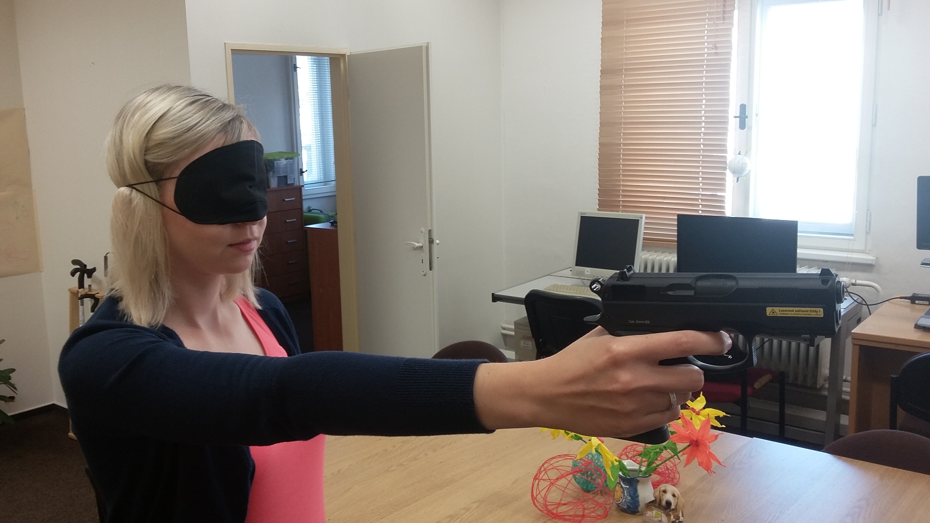 Jde o laserový trenažér, kde postoj a držení pistole odpovídá běžné střelbě, zaměřování na střed terče se provádí sluchem – střelec je naváděn zvukem, který se mění podle dopadu paprsku na terč- laserovým paprskem. Simulovaná střelba rozvíjí jemnou motoriku a schopnost soustředění nevidomých. Pomáhá jim odreagovat se od stresů a problémů, které se neustále objevují v životě zrakově postižených lidí. Laserový trenažér, který běžně slouží zdravým sportovcům k přípravě na ostrou střelbu je upraven tak, že umožňuje nevidomým plnohodnotný střelecký sport.